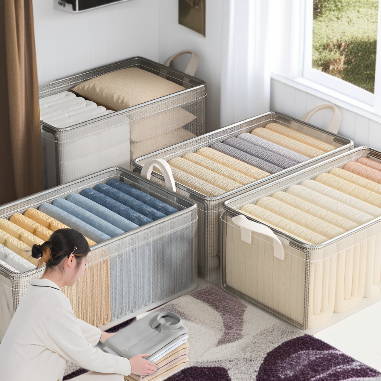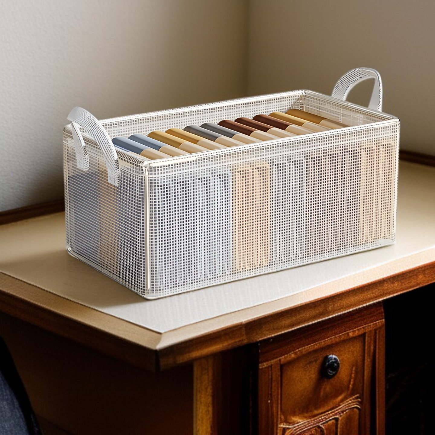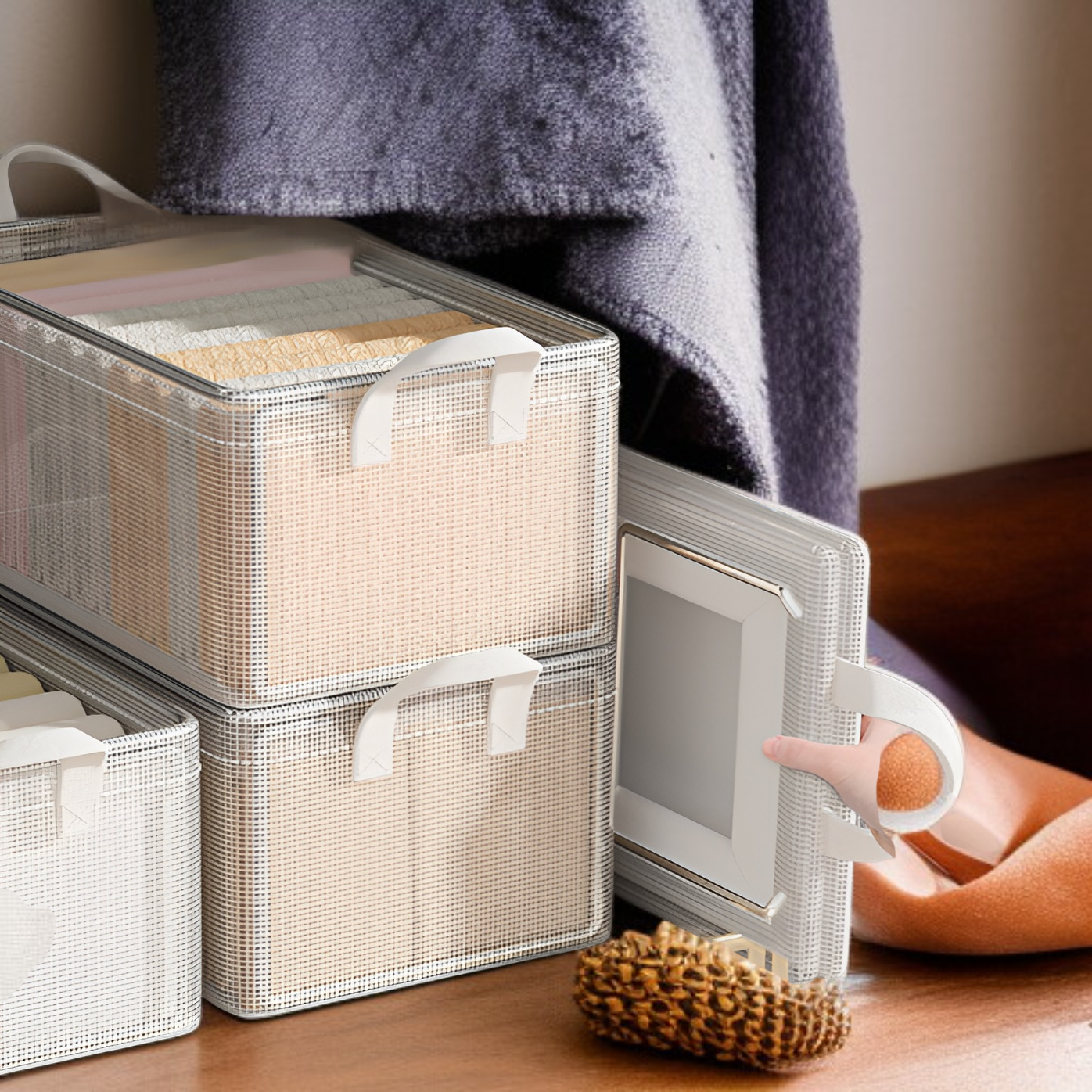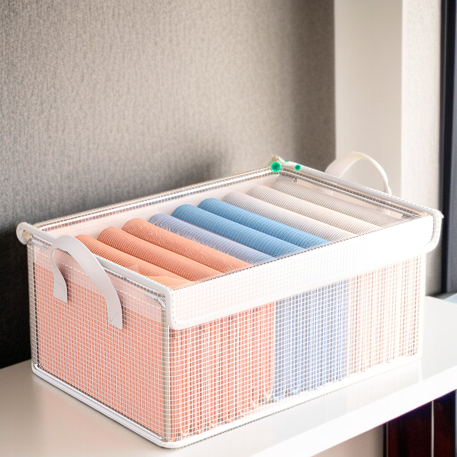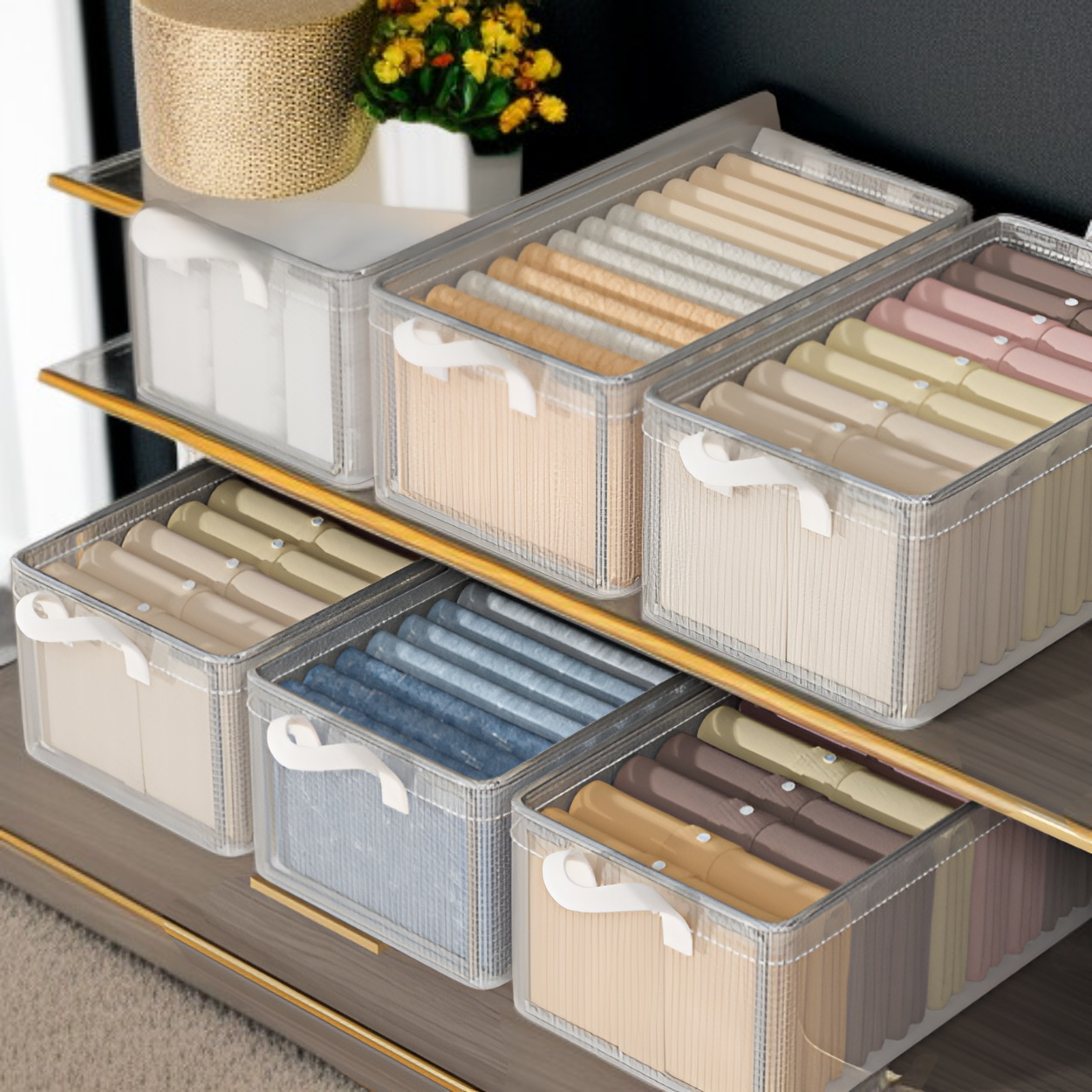 衣類やパンツを効率的に収納できる8個パックの収納ボックス。階層型設計でワードローブ内を整理しやすく、耐久性のあるアーティファクト収納フレーム付き。